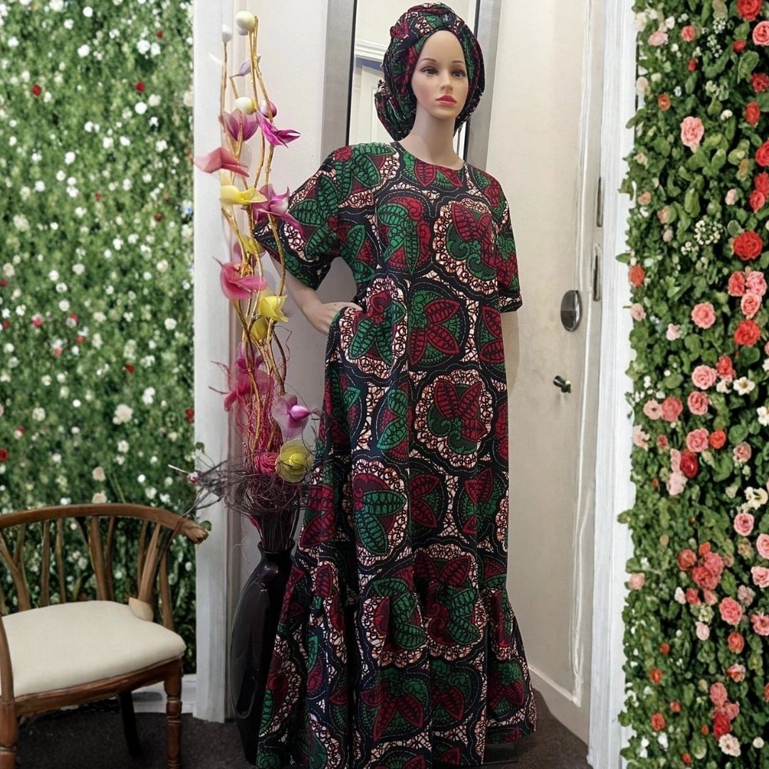 A traditional African maxi dress with bold, colorful Ankara prints and a matching headwrap, radiating cultural elegance and timeless style.