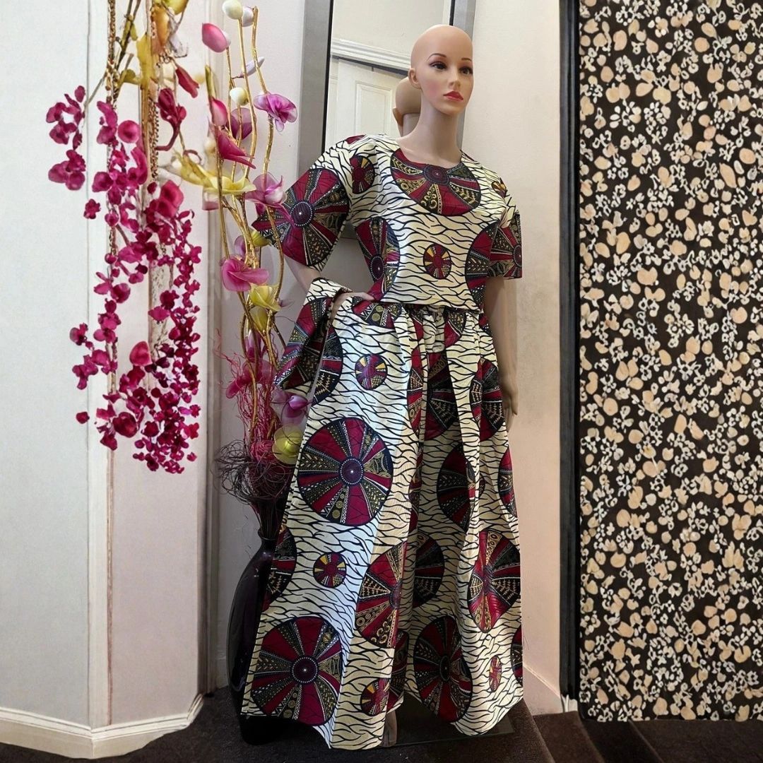A bold and elegant African-print ensemble featuring a fitted top and a flowing maxi skirt, showcasing vibrant geometric patterns and cultural flair.