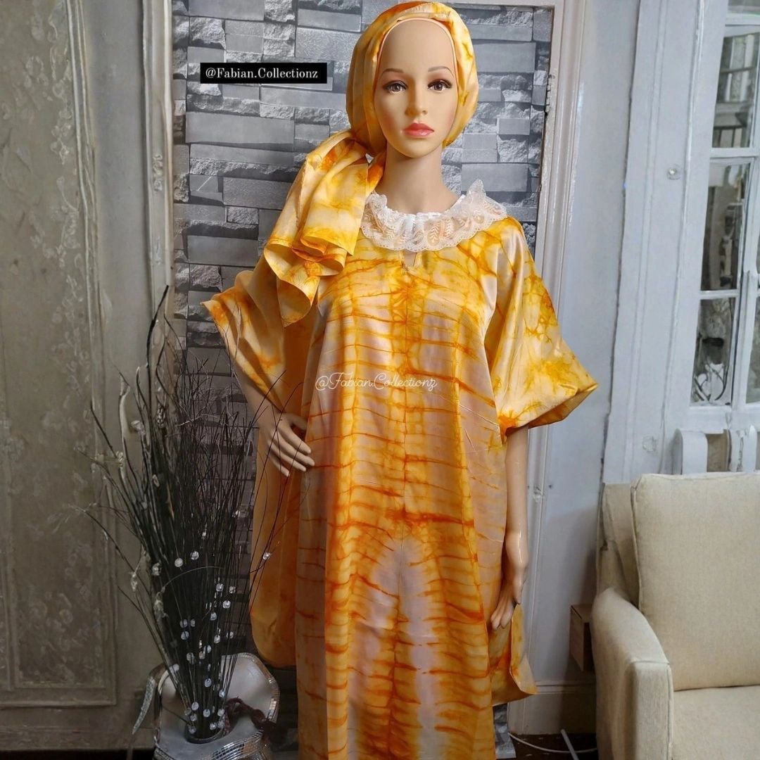 A flowing traditional African kaftan with a rich tie-dye pattern in warm earthy tones, paired with a matching headscarf for a graceful, cultural look.
