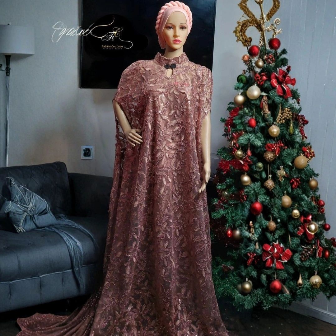An elegant, floor-length lace kaftan featuring intricate floral embroidery and a flowing silhouette that exudes luxury and grace.