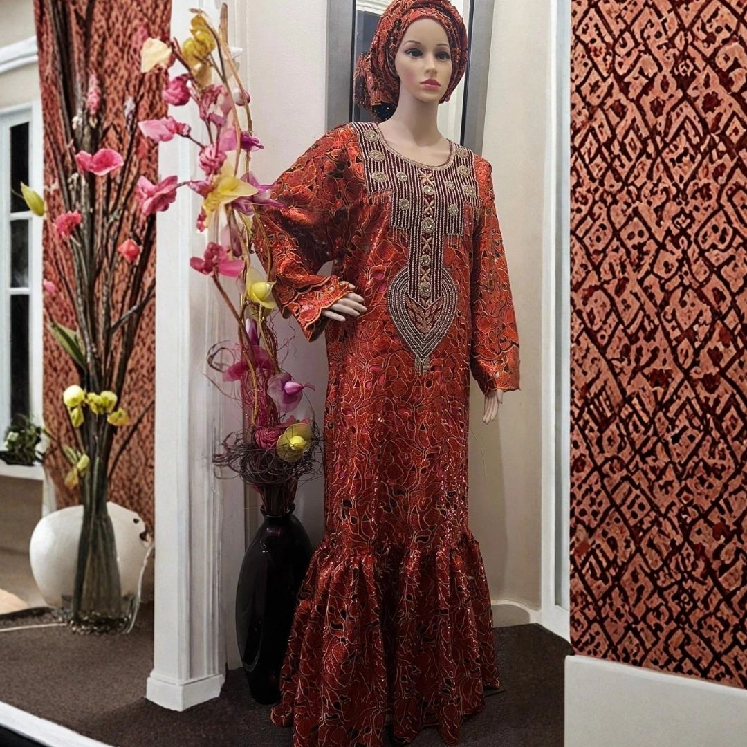A vibrant traditional African gown featuring intricate embroidery and rich patterns, blending elegance with cultural sophistication.